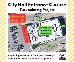 Beginning Monday, October 6, 2025, tuckpointing work will begin on the west façade of City Hall. The project is expected to last approximately four weeks.